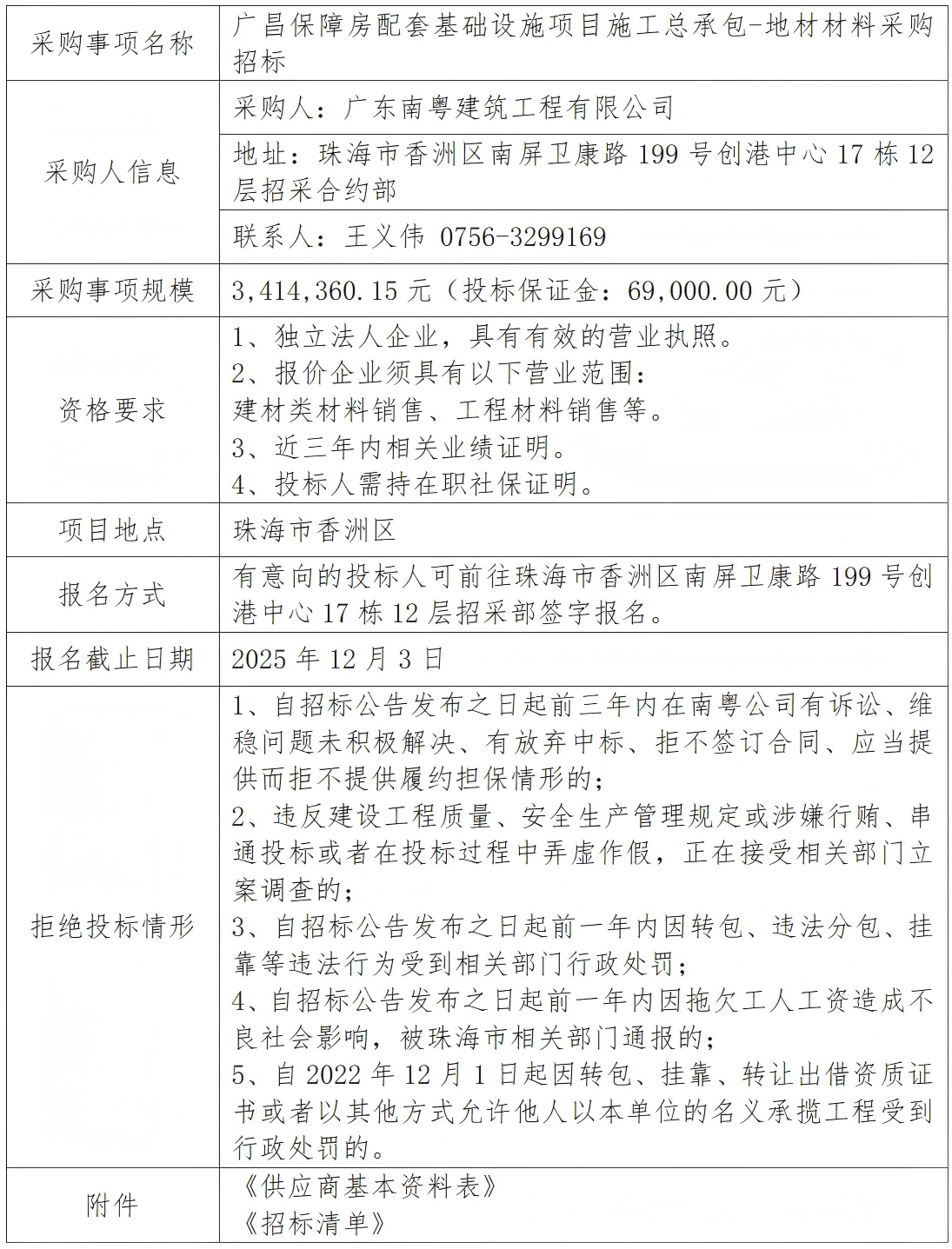 廣昌保障房配套基礎設施項目施工總承包-地材材料采購招標 專欄:工程招標 發(fā)布日期: 2025-11-27 作者:招采管理中心 附件:供應商基本資料表 附件:廣昌保障房配套基礎設施項目施工總承包-地材材料采購招標清單 返回列表 上一篇:廣昌保障房配套基礎設施項目施工總承包--土石方工程專業(yè)分包 下一篇:2025年財務審計服務采購