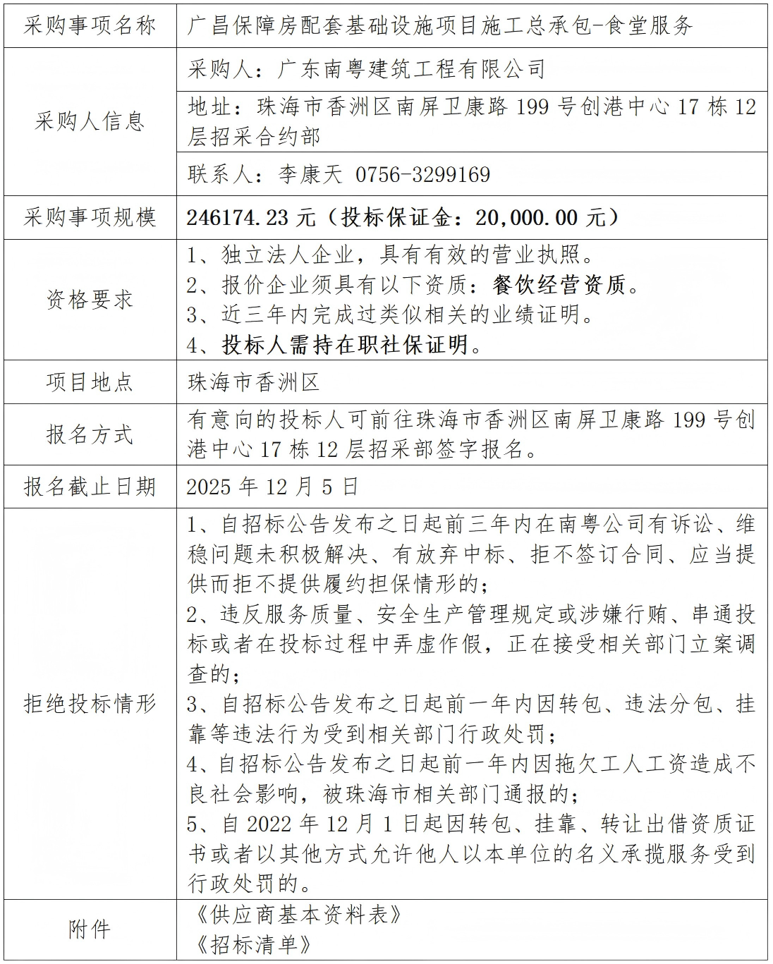 廣昌保障房配套基礎(chǔ)設(shè)施項(xiàng)目施工總承包-食堂服務(wù) 專(zhuān)欄:工程招標(biāo) 發(fā)布日期: 2025-12-02 作者:招采管理中心 附件:供應(yīng)商基本資料表 附件:廣昌保障房配套基礎(chǔ)設(shè)施項(xiàng)目施工總承包-食堂服務(wù) - 空白清單 返回列表 上一篇:廣昌保障房配套基礎(chǔ)設(shè)施項(xiàng)目施工總承包-安保、保潔服務(wù) 下一篇:廣昌保障房配套基礎(chǔ)設(shè)施項(xiàng)目施工總承包--土石方工程專(zhuān)業(yè)分包