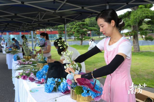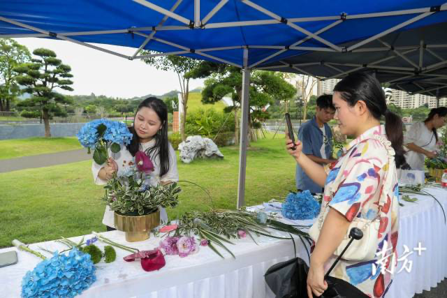 據(jù)了解,香洲區(qū)首屆園藝景觀大賽包含了“綠美街巷”“街頭景觀”“理想花園”“花植風(fēng)采”“藝術(shù)插花”等比賽。頒獎前,大賽舉行了最后一場比拼——“藝術(shù)插花”比賽。決賽選手根據(jù)現(xiàn)場提供的花卉素材,開始他們的藝術(shù)創(chuàng)作。評審反復(fù)觀察,為選手的作品打分。來賓們也紛紛前來觀看,交流插花藝術(shù)經(jīng)驗。