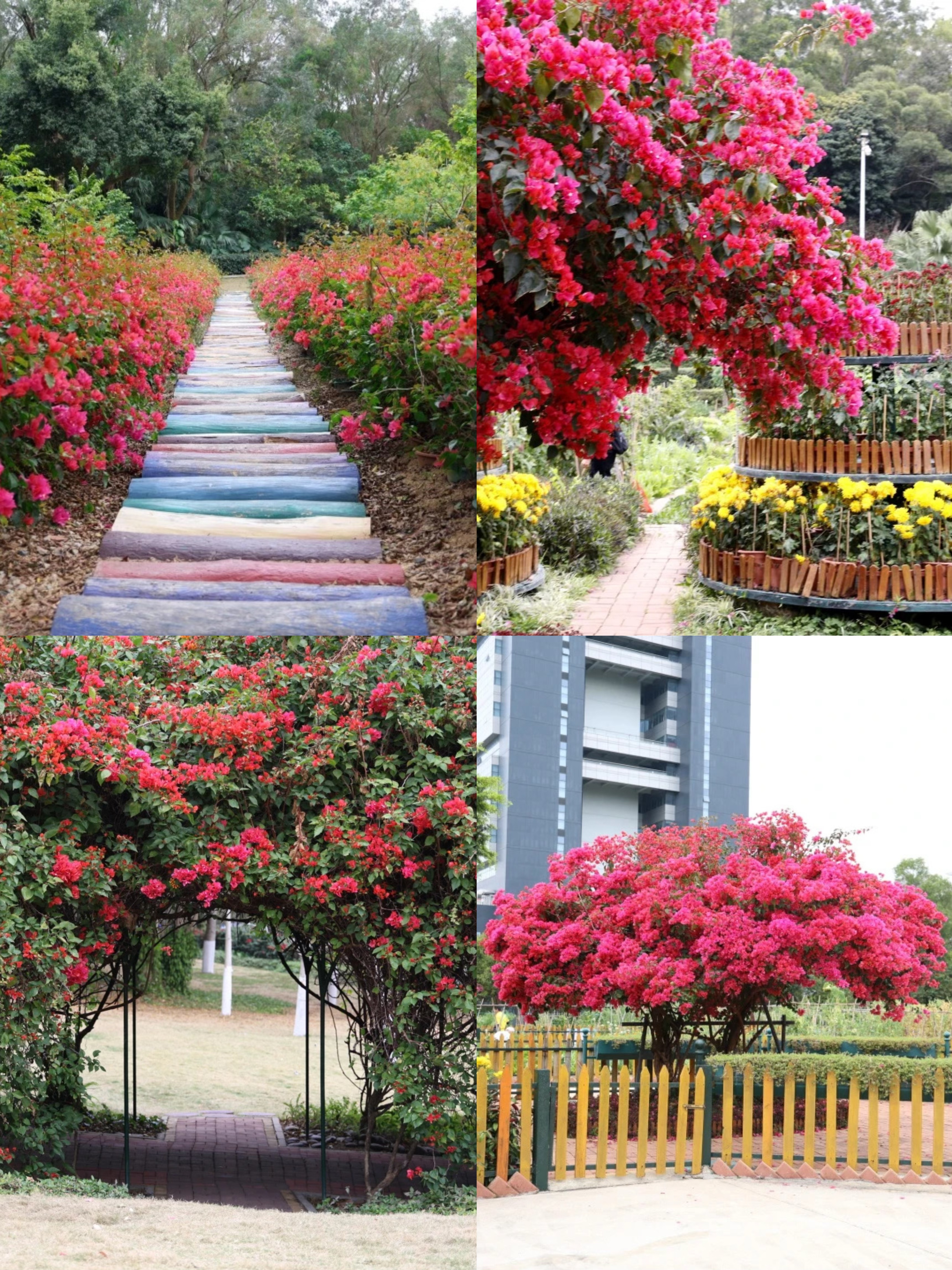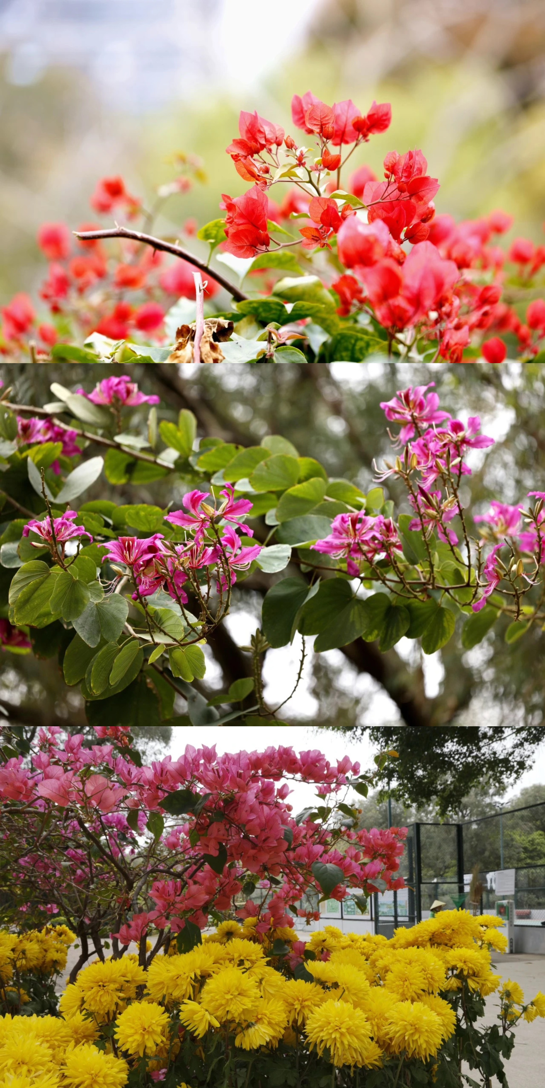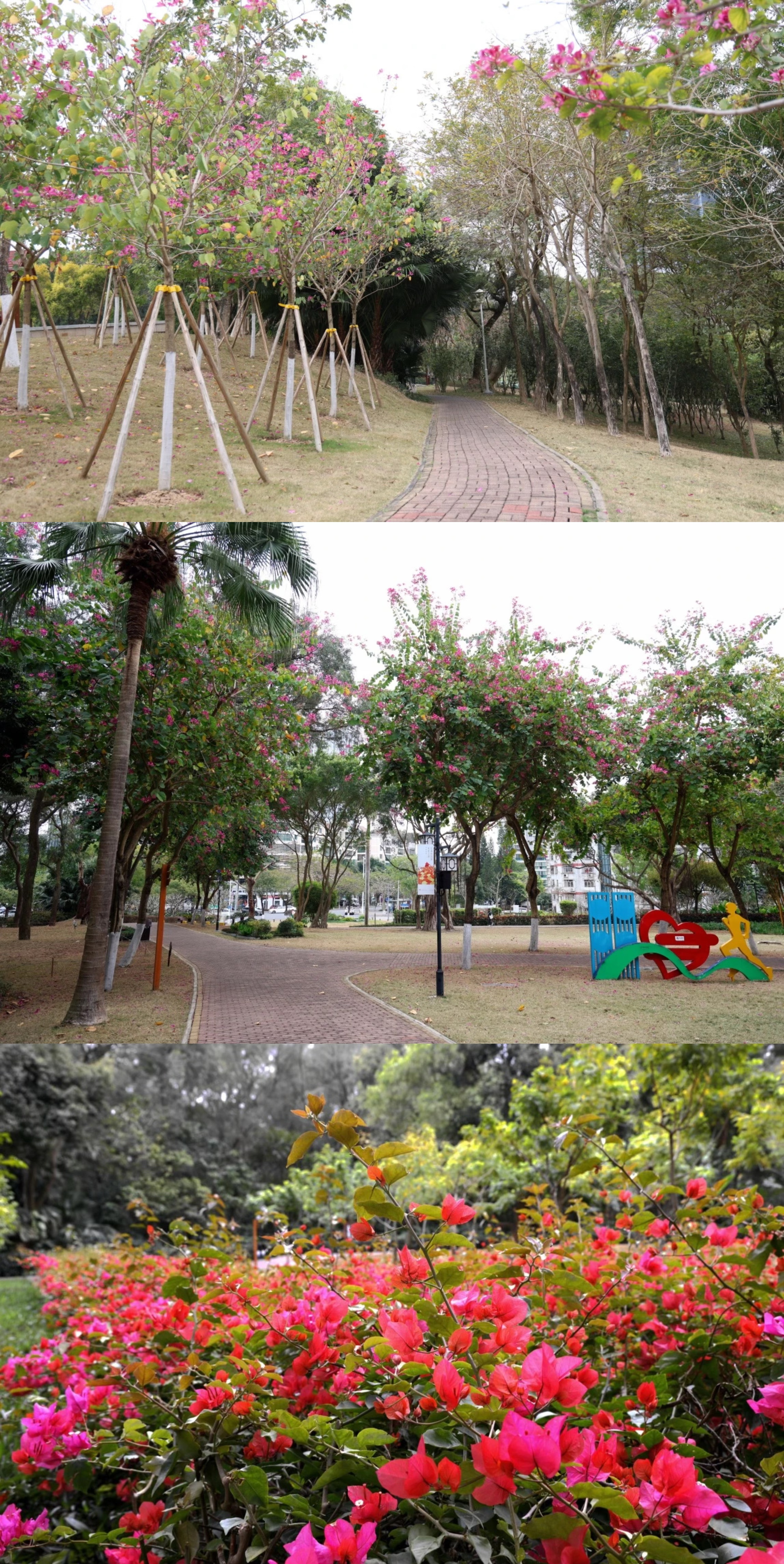 炮仗花、紅花紫荊、宮粉紫荊、木棉、火焰木、勒杜鵑、鳳凰木、黃槐、紫羅蘭……有的正值花期,有的含苞待放,盎然的春意將公園點綴得五彩斑斕。