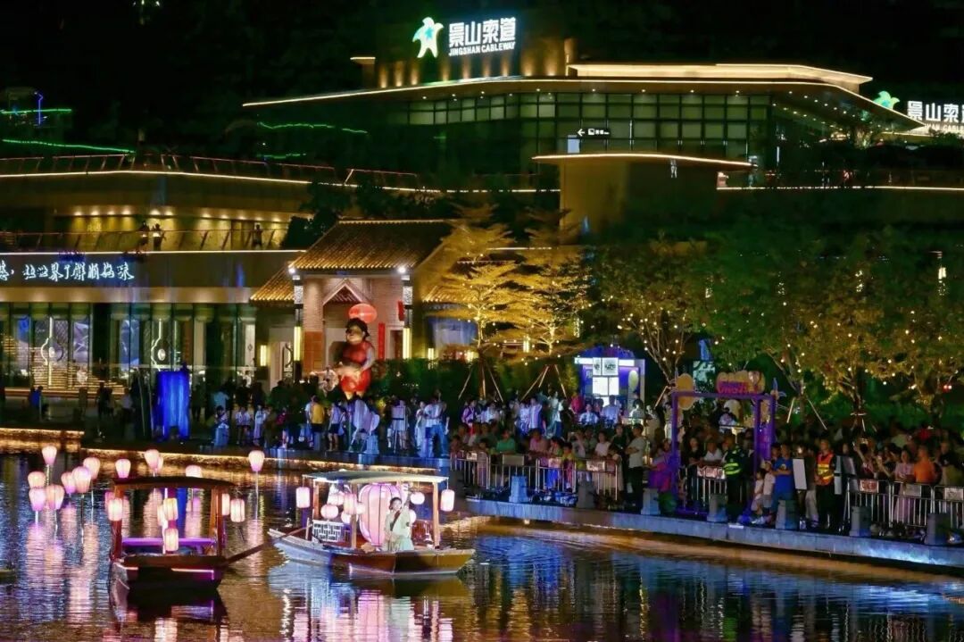 10月2日晚,夜色漸濃,正方優(yōu)和匯·城市陽臺(tái)中秋宮廷花燈會(huì)的百余盞宮廷花燈,在翠湖岸邊驟然點(diǎn)亮。華燈初上時(shí),暖黃、柔粉等各色燈光透過紗絹燈罩漫開,在湖面映出搖曳的光影。湖心上緩緩駛過一艘小船,琵琶演奏者在船上指尖輕撥,樂聲伴燈影浮動(dòng)。這片兼具古樹、疊石、湖心亭的嶺南特色水岸,瞬間化作古意盎然的“光影秘境”,引得市民游客紛紛駐足、打卡記錄。