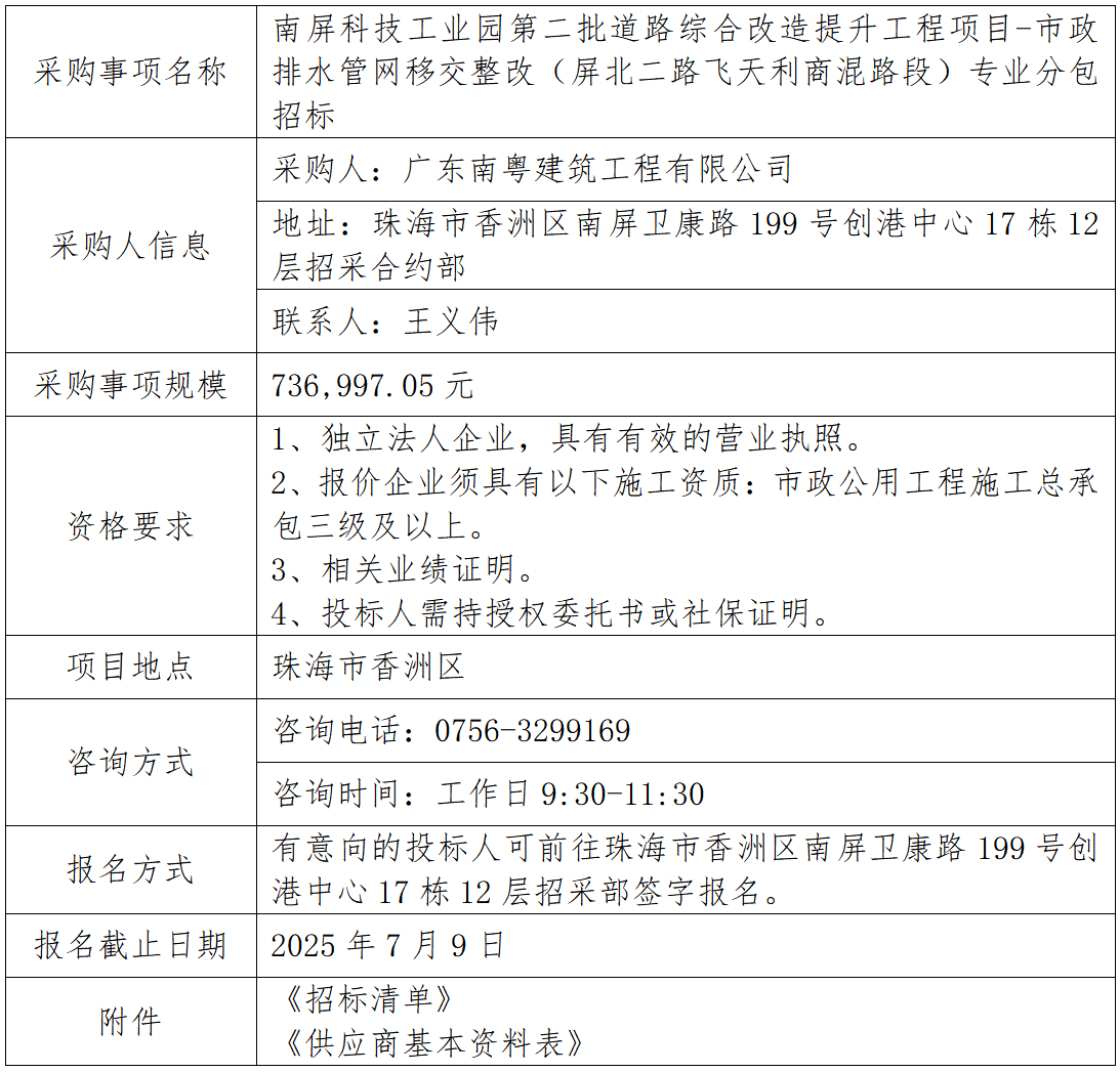 南屏科技工業(yè)園第二批道路綜合改造提升工程項目-市政排水管網(wǎng)移交整改(屏北二路飛天利商混路段)專業(yè)分包招標 專欄:工程招標 發(fā)布日期: 2025-07-04 作者:招采管理中心 附件:南屏科技工業(yè)園第二批道路綜合改造提升工程項目-市政排水管網(wǎng)移交整改(屏北二路飛天利商混路段)專業(yè)分包招標清單 附件:供應(yīng)商基本資料表 返回列表 上一篇:南屏科技工業(yè)園第三批道路綜合改造提升工程-移交整改專業(yè)分包 下一篇:鳳凰谷項目高壓線遷改工程-工程資料整理服務(wù)(延期掛網(wǎng))