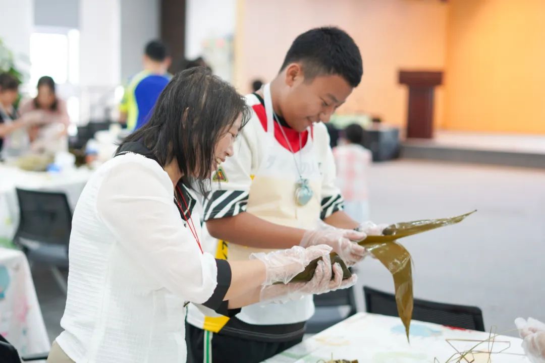 本次活動加入了端午節(jié)元素,讓孩子們在游戲的同時更多了解中國傳統(tǒng)文化。小朋友們在老師的帶領(lǐng)下學(xué)習(xí)如何包粽子,折粽葉、裝糯米、放餡料、裹扎繩,一只只粽子就此成型,大家看著自己的勞動成果樂不可支,雖然粽子的形狀五花八門,但每個人心里都充滿了成就感。