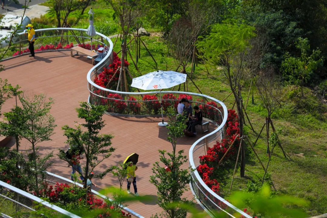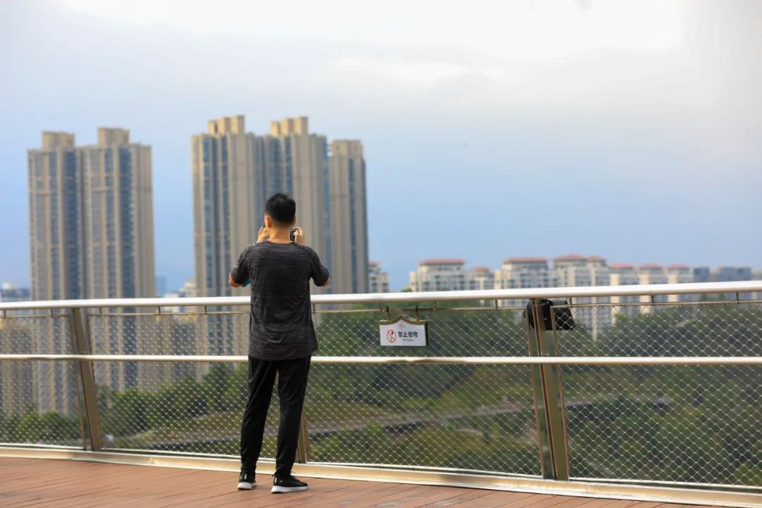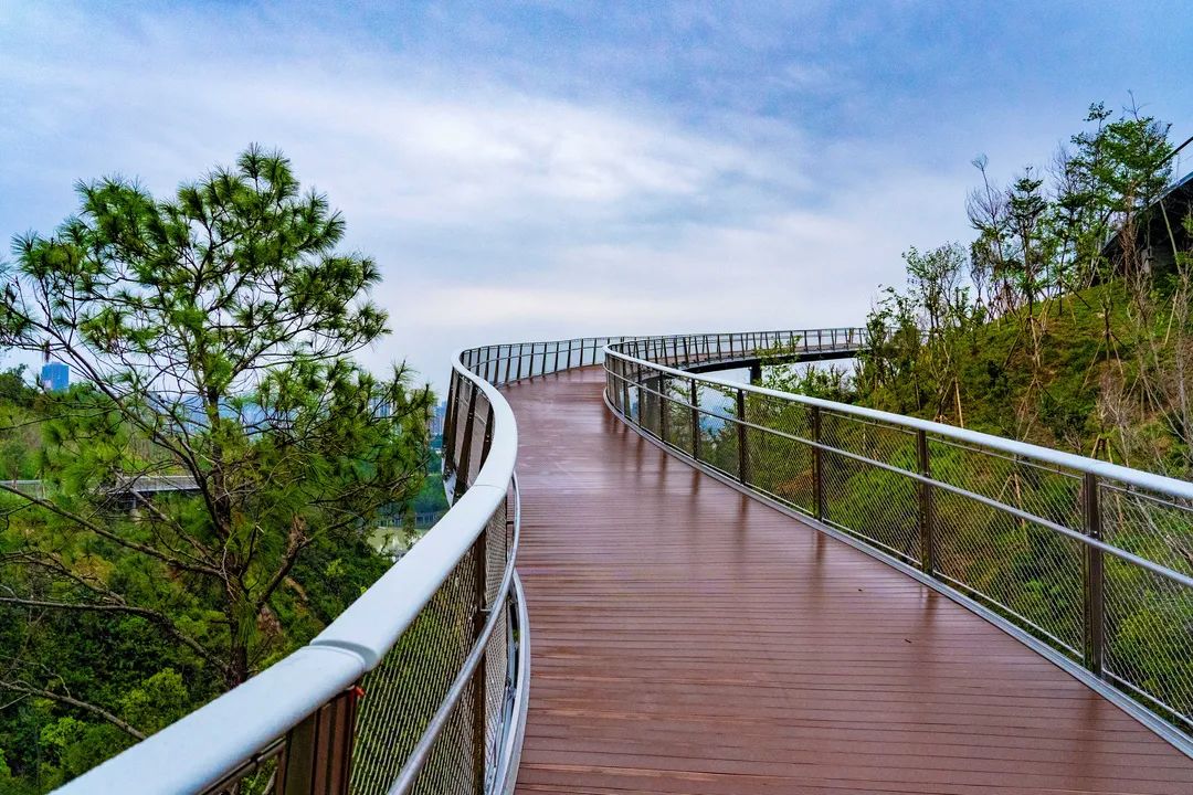 在“以人為本”的設計理念下,游覽者避免了登山拾階而上對膝蓋的損傷,踏步云道如履平地,防滑木制材料增大了步道與鞋底的摩擦力,無(wú)論是中青年,還是老人、小孩,都可以輕松登上山頂,盡享城市與自然的絕美風(fēng)光。
