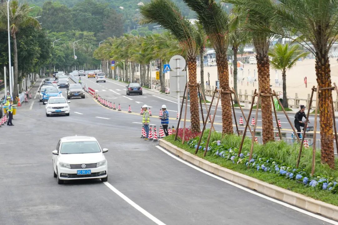 隧道北端海濱公園東門(mén)處原有的斑馬線(xiàn)改造為9米寬,增加過(guò)街效率;海之灣附近新增一處斑馬線(xiàn)過(guò)街,行人通過(guò)新建的人行步道可到達海濱公園東門(mén)。