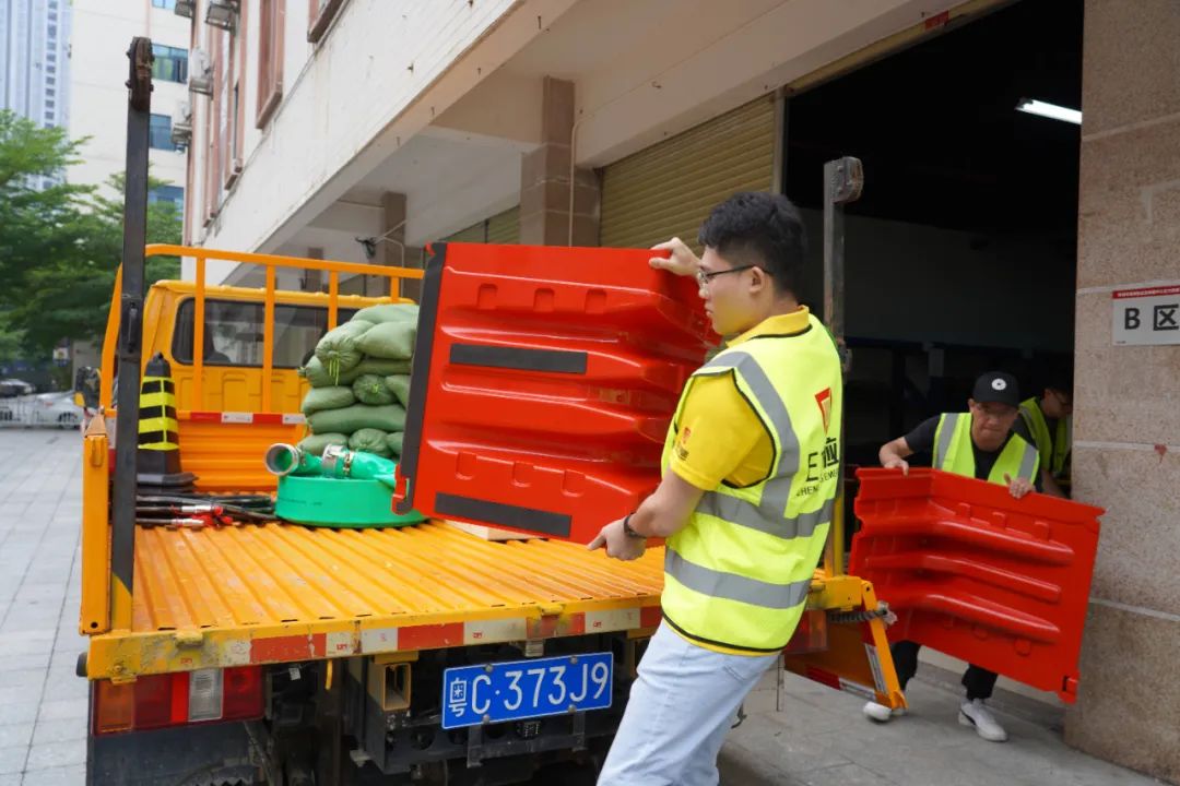 應急隊和應急車(chē)輛在倉庫火速集合,將抽水泵1臺、沙袋50個(gè)、擋水板30塊、鐵鏟10把等應急物資裝車(chē),運輸到城市陽(yáng)臺現場(chǎng)。