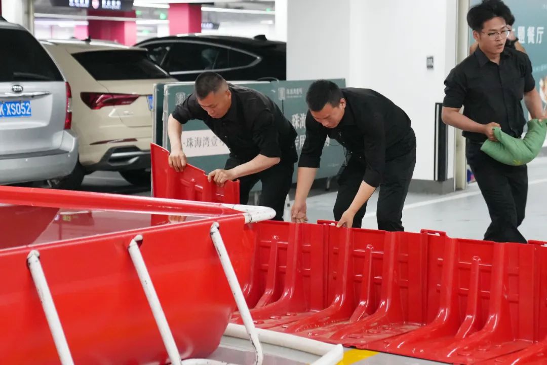 大雨傾盆,雨水不斷積聚。應急處置組調配人員,在車(chē)庫出入口處安裝防洪擋板,壓放沙袋,阻擋雨水漫入。