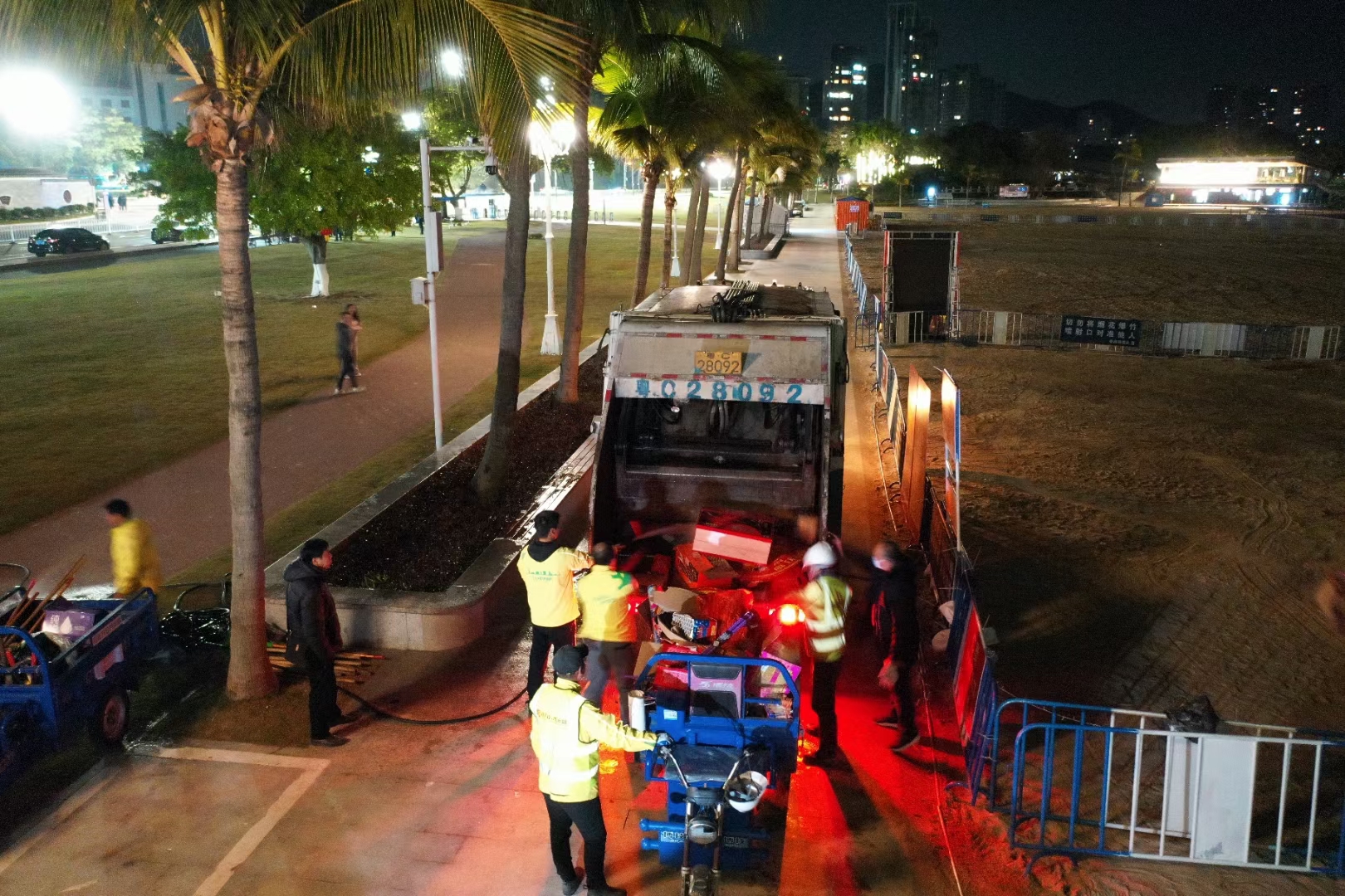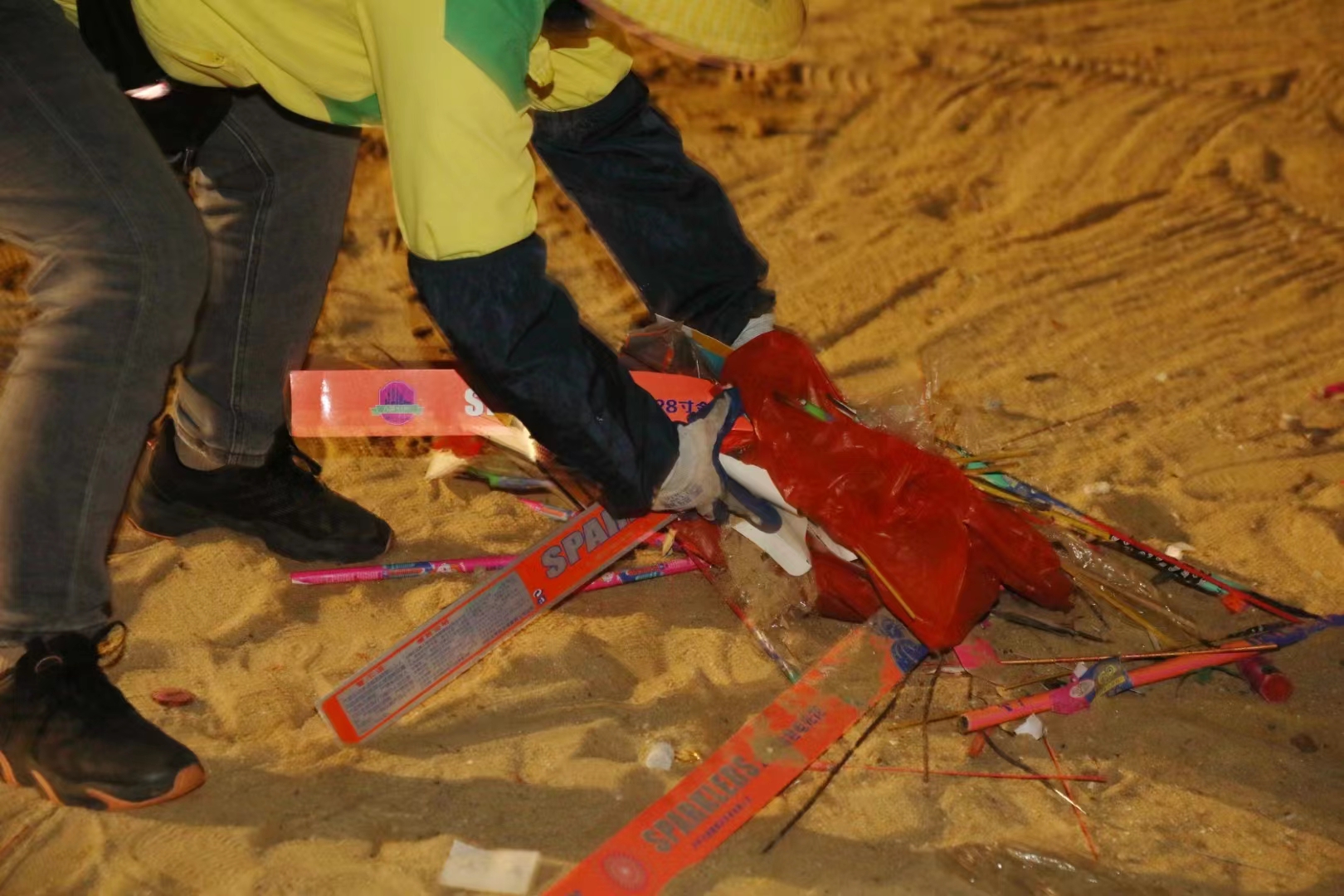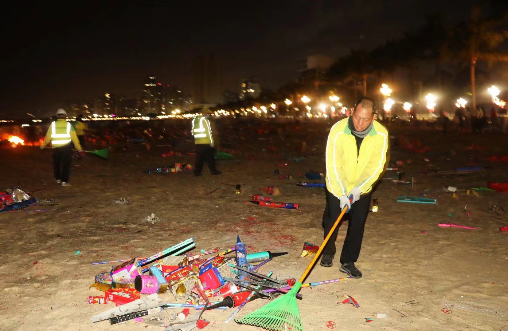 本次煙花燃放清理工作的難點(diǎn)區域是海天公園沙灘。大型煙花燃放后,大量的碎屑會(huì )隱藏在沙子里。為此,保潔清理隊伍分條塊對海灘進(jìn)行仔細梳理清潔,靠人力一點(diǎn)點(diǎn)撿拾,將沙子里混雜的煙花爆竹碎屑梳理出來(lái),然后用拖運車(chē)轉運至集中存放點(diǎn)。