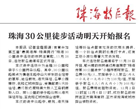 本報訊 記者金璐報道:有意參加第五屆“最美海岸·珠澳同行”珠海30公里徒步活動(dòng)的市民注意啦,11月28日,活動(dòng)報名通道將正式開(kāi)啟。