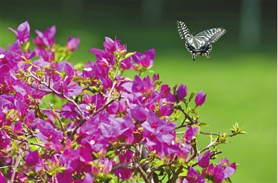 恰好是珠海短暫而美好的秋景,在一城、一園中完整而盛大地展現。沐浴在秋日的陽(yáng)光里,高矮灌木錯落有致,五彩花卉爭奇斗艷,久居家中的市民在園中小徑悠閑漫步,健身器材上老者踢腿扭腰。這一片生機之中,成群結隊翩翩飛舞的蝴蝶,最為吸引目光。