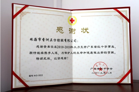 珠海市香洲正方控股有限公司總經(jīng)理助理黃少蘭代表公司出席會(huì )議。會(huì )議特設省領(lǐng)導致謝捐贈人環(huán)節,香洲正方因貢獻突出,榮獲多項榮譽(yù)。