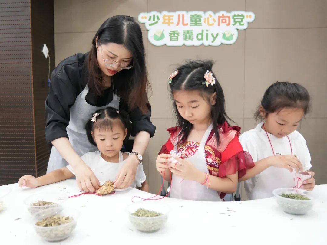 活動(dòng)現場(chǎng),孩子們在爸爸媽媽的帶領(lǐng)下簽到,然后興致勃勃地圍上圍裙、戴上五彩繩、領(lǐng)取香囊,迫不及待地奔向活動(dòng)游戲區、甜品區和香囊DIY區參與現場(chǎng)的活動(dòng)。